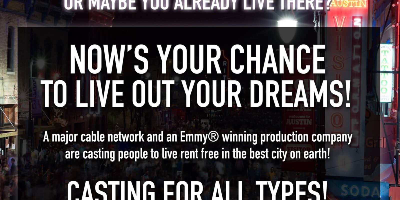 The casting ad asks, “Have you always aspired to live in Austin, Texas, or maybe you already live there? Now’s your chance to live out your dreams!”