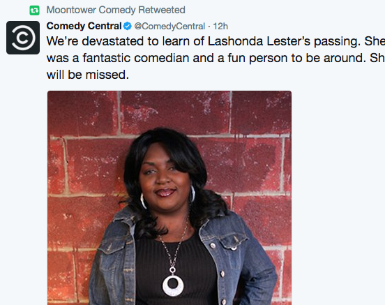 I just learned Lashonda Lester passed away. She opened for me last week in Austin. Very sad. Very funny person. RIP